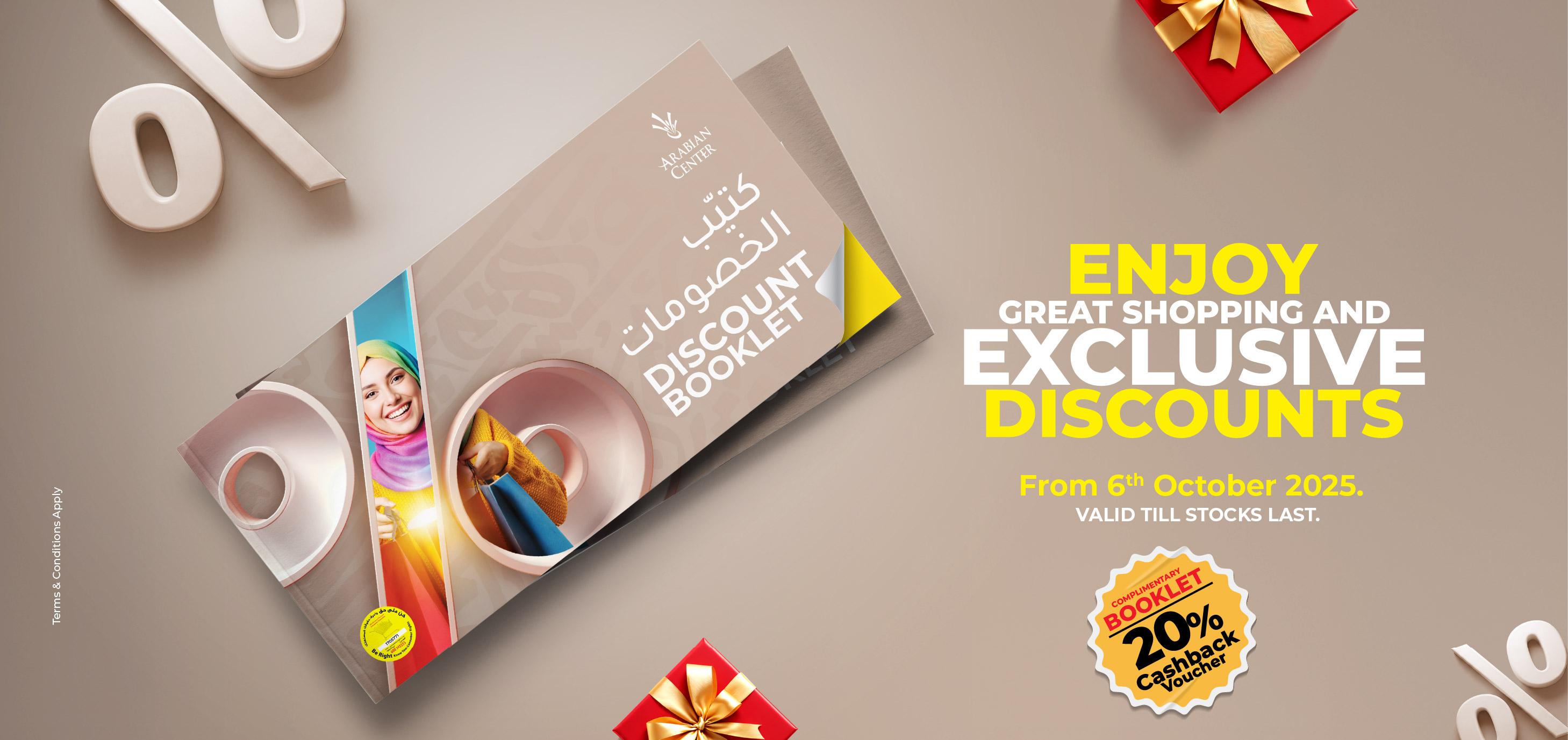 This discount booklet (the “Booklet“) provides holders with access to various discounts and offers from Arabian Center Mall. By using this Booklet, you agree to the following terms and conditions.
